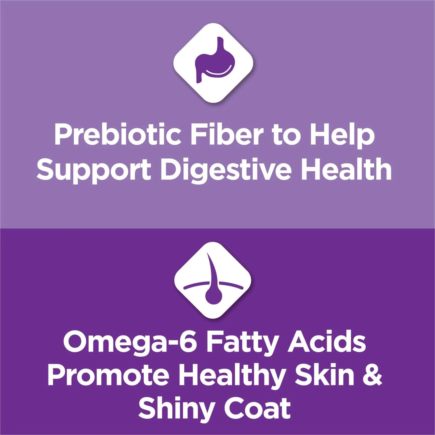 - This kibble is loaded with natural prebiotic fiber to help support digestive health plus omega-6 fatty acids to promote healthy skin and a shiny coat.