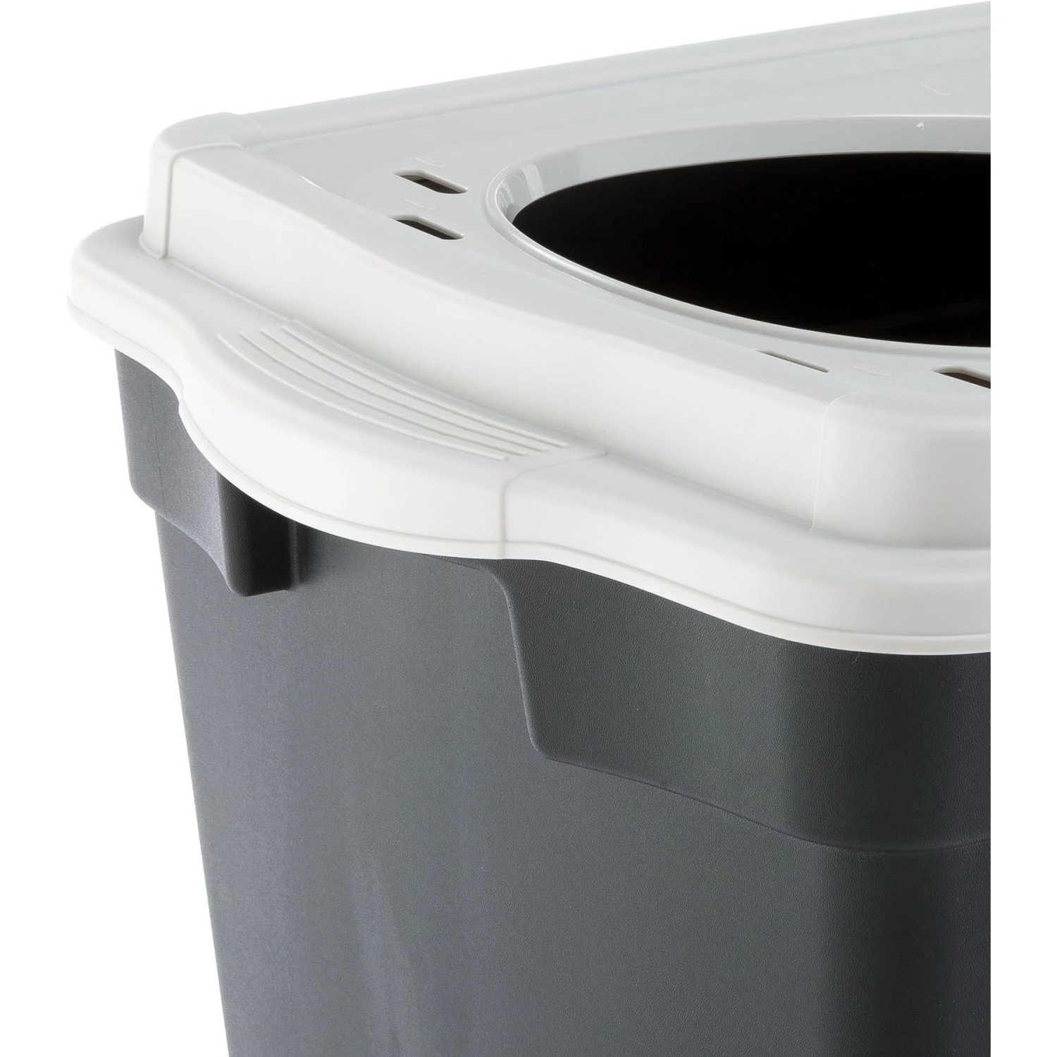 - Covered litter box with top entrance helps to keep litter from spilling out, and stops dogs from nosing about or digging.