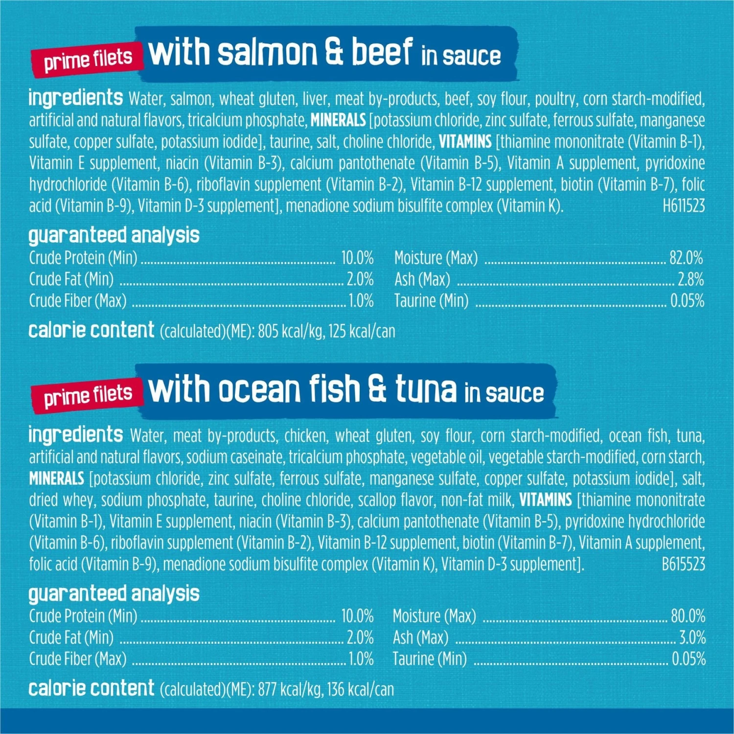 | Flavor | Chicken & Salmon, Variety Pack: Beef, Poultry, Fish, Whitefish & Sardines, Salmon, Variety Pack: Beef & Poultry, Ocean Whitefish & Tuna, Beef, Turkey & Cheese, Chicken, Variety Pack: Chicken Lovers, Variety Pack: Fish-a-Licious, Turkey & Giblets |